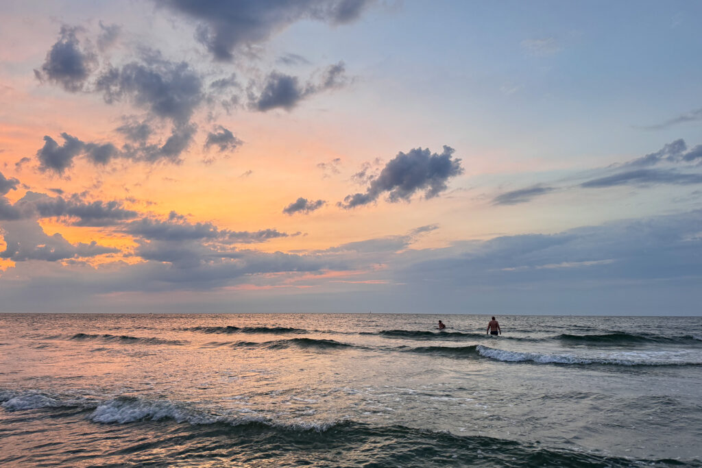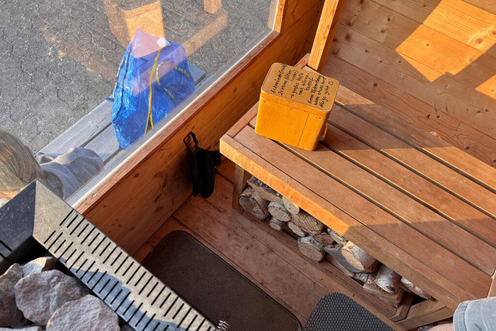 Drei Saunagänge haben wir in den zwei – beziehungsweise ohne die Auswährmphase gut 1,5 – Stunden gemacht. Getränke und Snacks hatten wir mitgebracht und so saßen wir nach dem erfrischenden Bad in der Ostsee vor den Sauna auf der Holzbank, füllten unsere Flüssigkeitsspeicher auf und genossen unser Saunaerlebnis.
