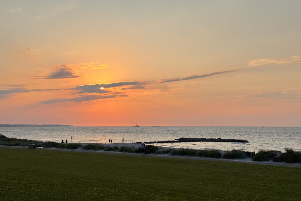 Nach gut 20 Minuten gingen wir zurück, fegten uns den Sand von den Füßen, schnappten uns unsere Handtücher und machten es uns auf den Holzbänken am Saunaofen gemütlich. Draußen zogen die Schiffe übers Meer, die Sonne tauchte alles in ein warmes Orange, Radfahrer fuhren am Deich entlang und ein paar hoffnungsvolle Kiter bauten ihr Material auf (es herrschte sehr wenig Wind…). Wir saßen im sehr Warmen, genossen die Aussicht und waren gleichzeitig versteckt hinter dem verspiegelten Glas der großen Panoramascheibe.