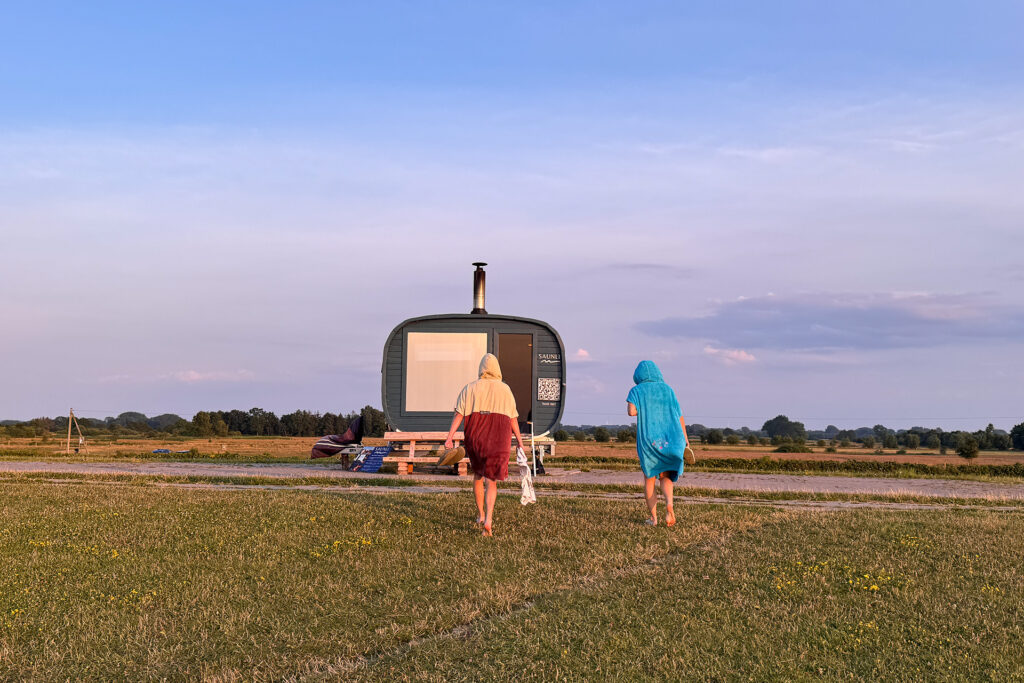 An einem Spätabend im Juli haben wir genau das gemacht. Die Buchung war denkbar einfach: Auf der Internetseite muss man sich für den zweistündigen oder den 2,5-stündigen Aufenthalt entscheiden (für 69 Euro bzw. 79 Euro für zwei Personen). Dann wählst du deinen Wunschtermin, fügst gegebenenfalls noch weitere Saunagänger*innen hinzu, gibst deine Daten in das Buchungsformular ein und schickst es ab. Du erhältst dann eine E-Mail zur Bestätigung. Über diese E-Mail-Adresse kannst du auch – völlig unproblematisch und fix – Änderungswünsche besprechen.