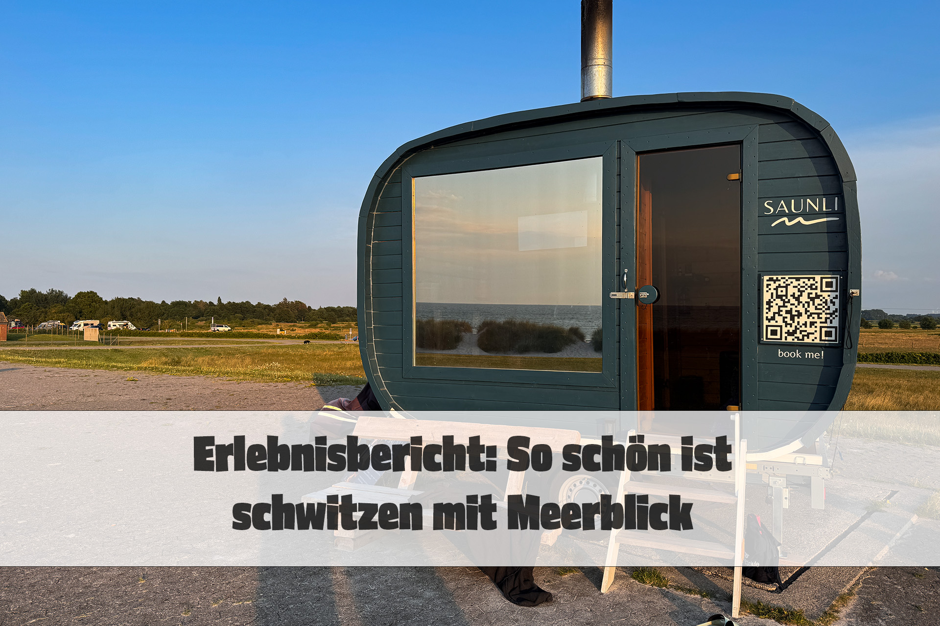 Sie ist klein, sieht aus wie eine Kreuzung aus Anhänger, Fasssauna und Wohnwagen: Eine ovales Häuschen mit langem, schmalen Schornstein sitzt auf einem Anhänger und blickt auf die Ostsee hinaus. In dem großen Panoramafenster an der Vorderseite spiegeln sich Wolken, Meer und die untergehende Sonne. Die Saunli in Heidkate wirbt allein durch ihre Präsenz damit, hier ein paar (herz-)erwärmende Stunden zu verbringen.