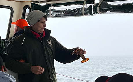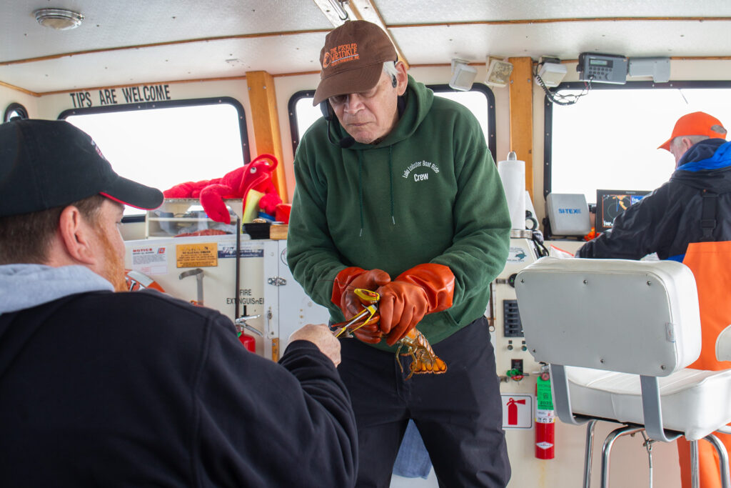 Nach einer Runde um Gaylons Lieblingsinsel – wie er sagt – geht es zurück. Dabei bekommen die Besucher weitere Details zu Maines Fischerei und den Gepflogenheiten der Fischer sowie lyrische Ergüsse ihres Reiseführers zu hören. Die Hummer kommen natürlich zurück ins Meer. Selbstverständlich ohne gelbe Gummibänder an den Scheren. Es ist eigentlich ganz einfach die Tiere am Unterleib zu packen – nur die Überwindung ist schwierig. Nicht, dass das Tier doch kneift.