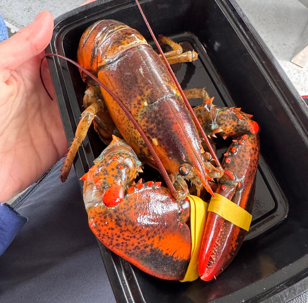 Jetzt sind wir dran: Wir dürfen mit einem speziellen Werkzeug dicke, gelbe Gummibänder um die Greifwerkzeuge befestigen. Dann kommen die Tiere in Schalen und dürfen betrachtet werden, während Gaylon alles über Lobster berichtet, das es zu wissen gibt – vom Unterschied zwischen Männchen und Weibchen, über die Größe der Scheren bis zu den Laichgebieten und Fangzeiten.